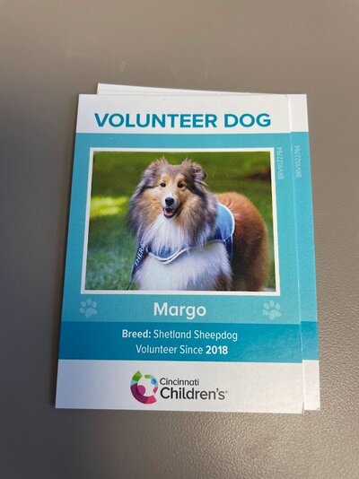 Our youngest daughter has complex medical issues and she and Pam realized how much impact a visit from a friendly dog can have when you're in the hospital. After seeing dogs lift our daughter's spirit, Pam vowed to have a volunteer therapy dog if we ever had the right dog. Scout and Margo are both Therapy Dogs at Cincinnati Children's Hospital. and we're hoping Margo's daughter June will follow in their path when she gets a bit older. Margo typically has a therapy gig about once a week at the hospital.